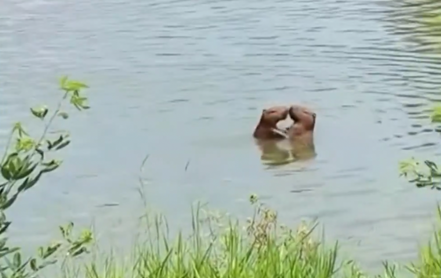 Capivaras são pegas em momento romântico à beira do lago na Universidade Rural de Seropédica