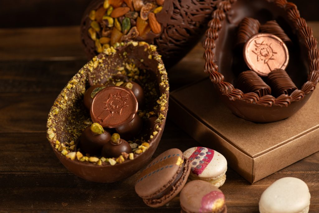Os ovos artesanais seguem a tradição da pâtisserie francesa, combinando técnicas clássicas com ingredientes modernos. Uma das opções é o Meio Ovo de Chocolate Amargo, com recheio de ganache de chocolate ao leite, caramelo com flor de sal e crocante de amêndoas. Além disso, acompanha cinco bombons recheados com ganache de caramelo, chocolate ao leite e cointreau, proporcionando sabores intensos e equilibrados.